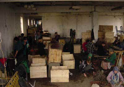 Процесс укладывания привитых саженцев в ящики для последующего хранения в теплице.